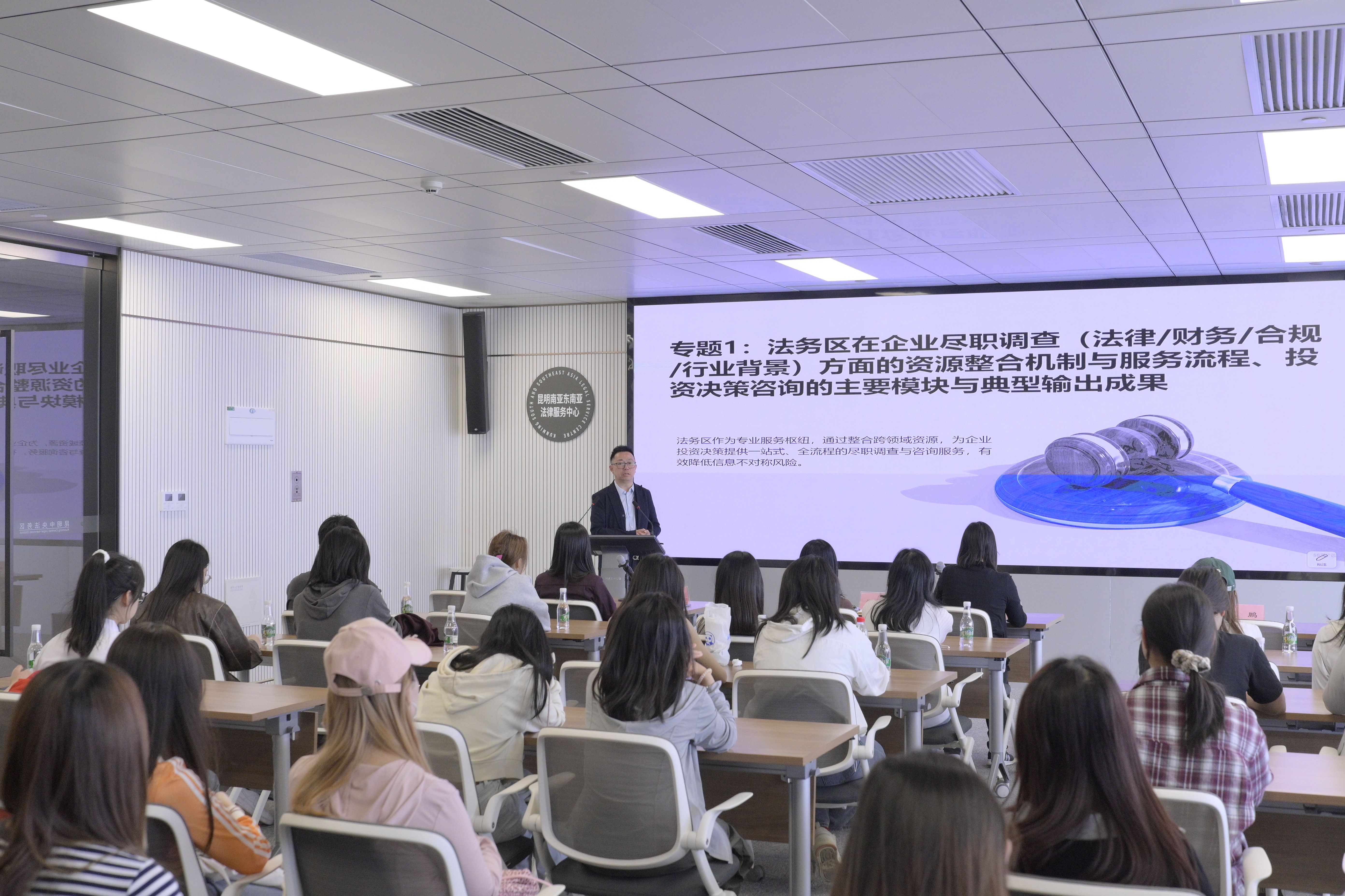 活动伊始,昆明中央商务区管委会综合协调处处长撒召禁带领师生实地参观,并详细介绍了法务区“一中心、三机构、五窗口”的建设布局与运行成效。近距离感受了涉外法治、跨境投资、商事仲裁等前沿实务场景。之后,双方举行了专题交流座谈会。昆明明健尽职调查咨询有限公司总经理、云南天健会计师事务所副总戴鹏,围绕法务区内企业在法律、财务、合规及行业背景等方面的尽职调查资源整合机制、投资决策咨询的核心模块进行了专题分享。昆明南亚东南亚法律服务中心副主任顾雨露深入解读了面向南亚东南亚跨境投资的尽职调查与风险防控实务要点。师生们就实习实践、职业发展、校企合作等话题与嘉宾展开热烈交流,现场气氛活跃。