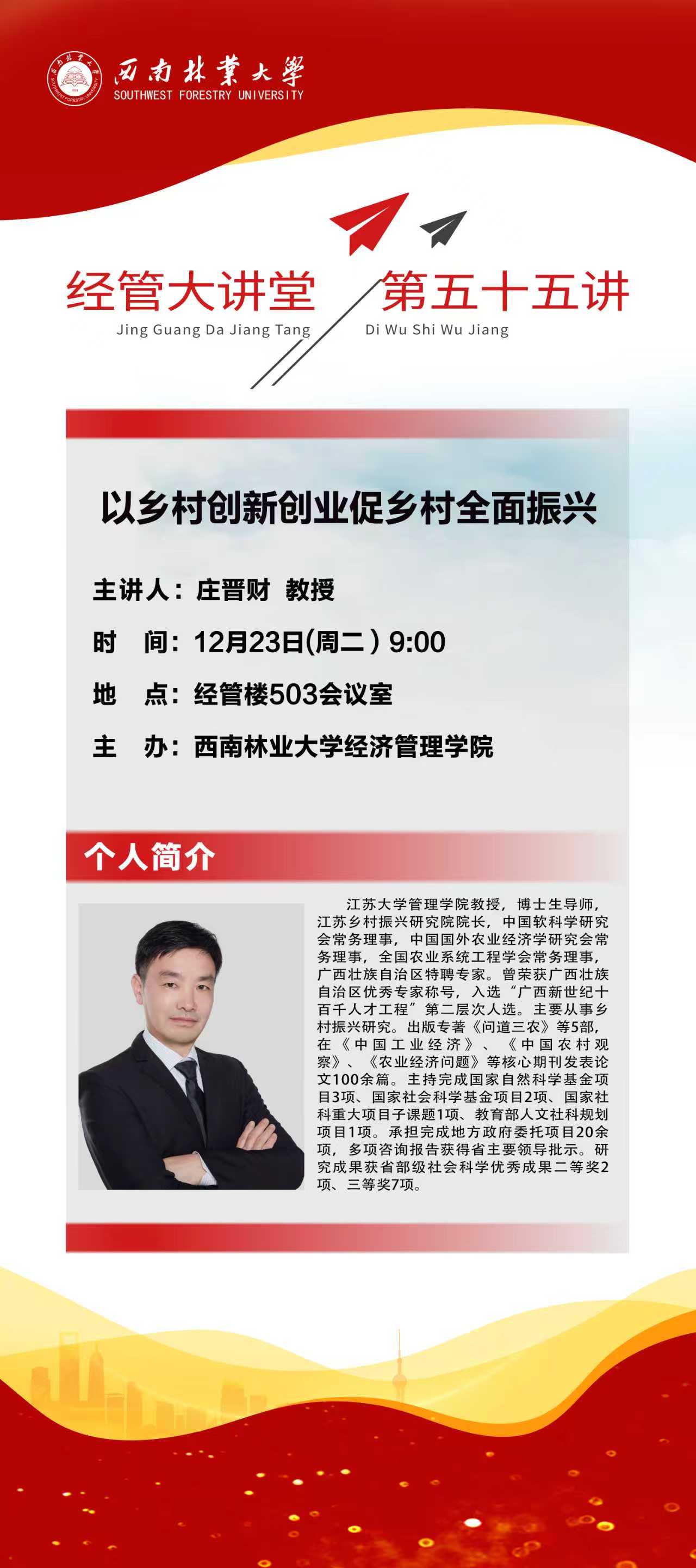 上一条:经管大讲堂第五十六讲:我院李建钦教授专题报告西南山区的林业生态安全:起源、要素与发展路径