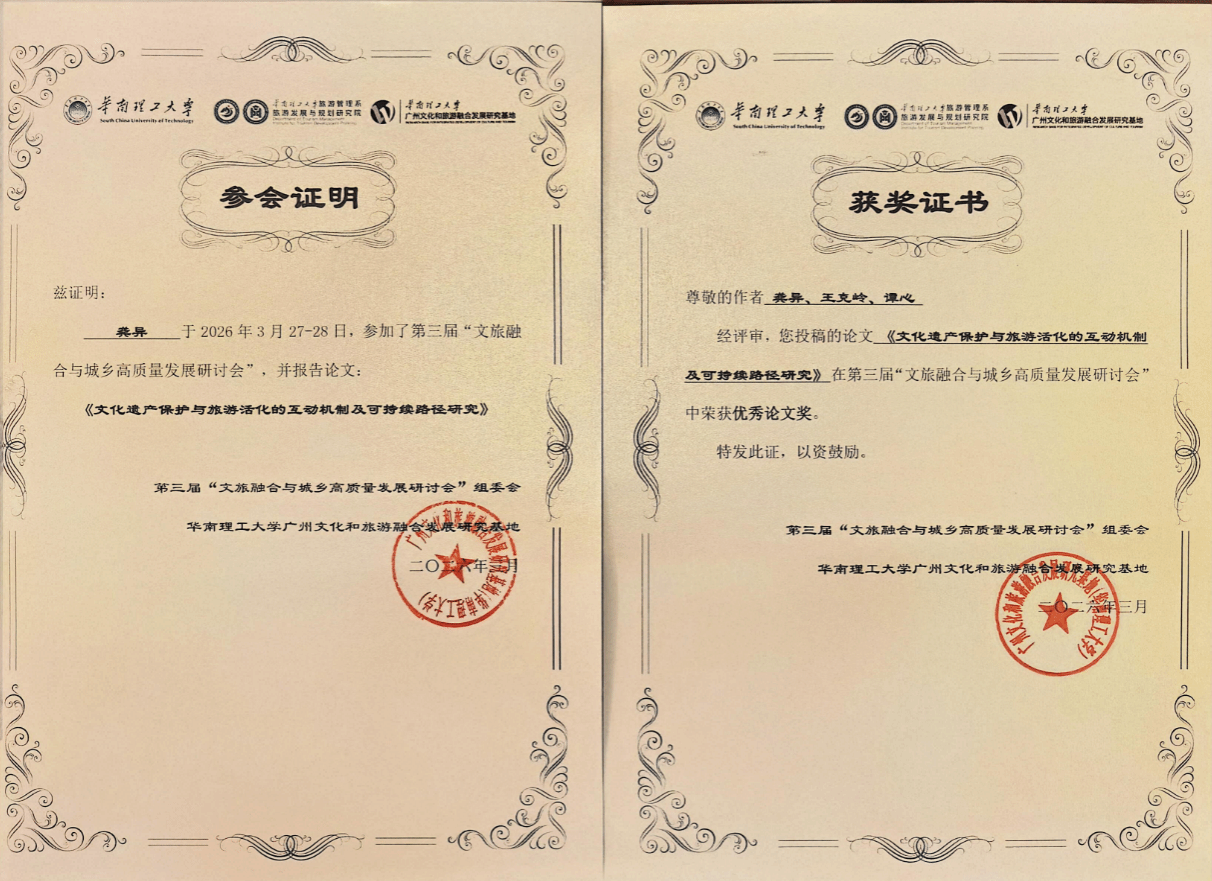 3月28日,第三届文旅融合与城乡高质量发展研讨会在华南理工大学成功举办。赌博网站 龚异团队撰写的学术论文《文化遗产保护与旅游活化的互动机制及可持续路径研究》经评审获评优秀论文,并在“文化遗产保护与旅游可持续发展”分论坛作专题学术汇报。